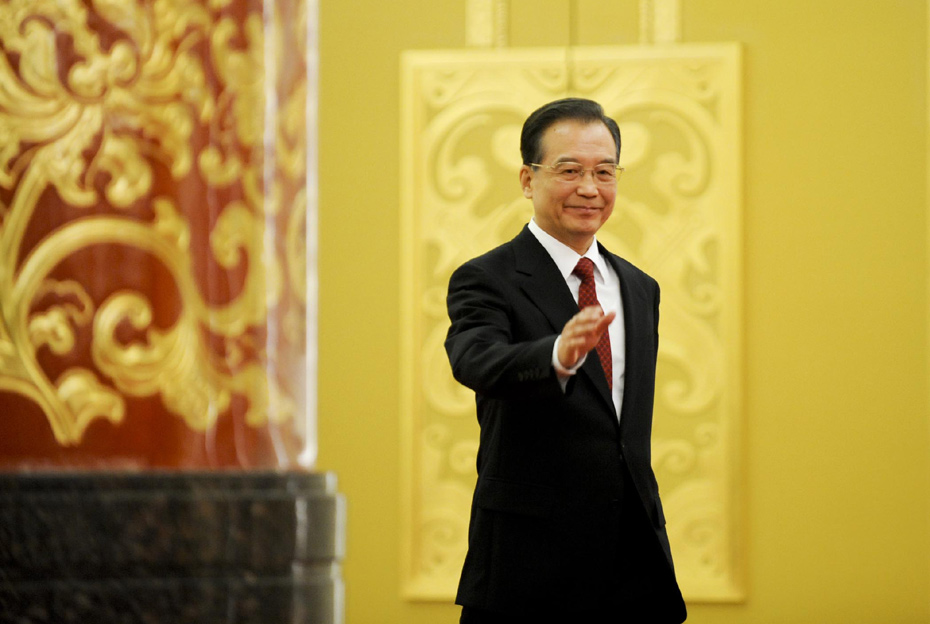 3月14日上午,國務院總理溫家寶在人民大會堂三樓金色大廳與采訪十一屆全國人大三次會議的中外記者見面并回答記者提出的問題。溫家寶總理闊步走進金色大廳。中新社記者 廖攀 攝 圖片來源:中國新聞網