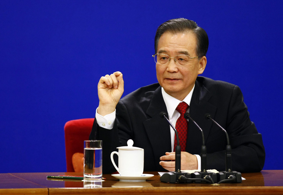 3月14日上午,國務院總理溫家寶在人民大會堂三樓金色大廳與采訪十一屆全國人大三次會議的中外記者見面并回答記者提出的問題。中新社記者 杜洋 攝 圖片來源:中國新聞網