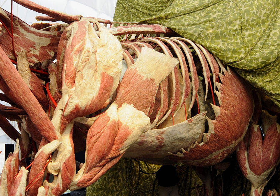 德國著名解剖學家鞏特爾·馮·哈根斯博士被稱為“死亡先生”,目前展出的是有史以來的最大的動物尸體。體型巨大的“桑芭”尸體高3.5米,重3.2噸。據悉“桑芭”將于2010年4月歸還諾因基興動物園。圖片來源:中國新聞網