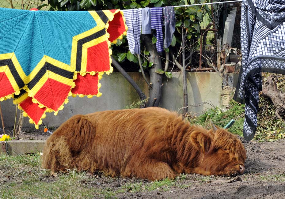 3月18日,德國一頭蘇格蘭高地牛來到一居民院內懶洋洋的曬太陽,最后經過獸醫的麻醉和消防員協力才將這頭蠻力十足的家伙“制服”。圖片來源:中國新聞網