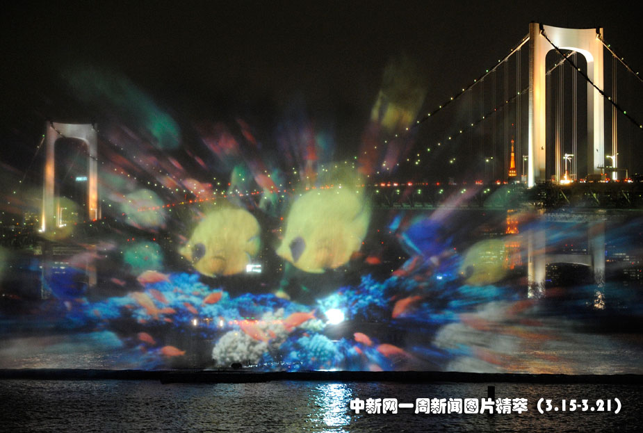 19日(周五)晚,在日本東京灣上演了一場美輪美奐的“海上幻燈。