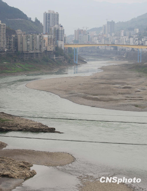 3月23日,重慶市武隆縣境內(nèi)的烏江段河床大面積裸露,河面嚴(yán)重變窄。近段時(shí)間以來(lái),受貴州、重慶地區(qū)持續(xù)干旱、來(lái)水減少的影響,烏江航道重慶段徑流量較常年減少40%以上,水位平均下降1米左右,船舶在航行過(guò)程中多次出現(xiàn)觸礁、擱淺等事故。當(dāng)?shù)胤姥纯购缔k公室透露,目前烏江重慶段已基本斷航,每天均有不少船只?看a頭等待上游的彭水電站調(diào)峰發(fā)電增大烏江水量,以便通過(guò)變得狹窄的烏江向下游航行。 中新社發(fā) 郭晉嘉 攝