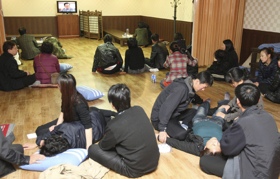 首爾當地時間26日晚9點45分許,在韓國西部海域執行警戒任務的天安艦(1200噸級)因不明原因事故,船底被炸開洞,船尾開始下沉。天安艦上共有104人,韓國巡邏艇和直升飛機迅速展開救援行動,事發5小時后,官員稱已救出58人,但因為強風和夜幕,救援行動進展緩慢,其它人員仍下落不明。圖為韓國海軍“天安艦”上士兵的家屬正圍在電視前等待消息。