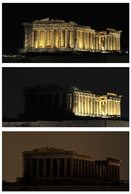 由世界自然基金會發起的“地球一小時”環保活動27日20點30分按照時區依次在全球數千個城市展開。圖為希臘帕特農神廟在熄燈前和熄燈后的景色。