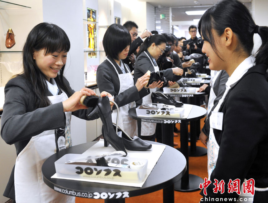 4月1日,日本一家鞋油廠新員工在入職儀式上為老員工擦鞋。圖片來源:中國新聞網