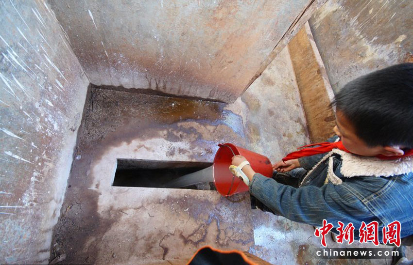 值日生用廢水收集桶里的水沖廁所。沙浪 攝