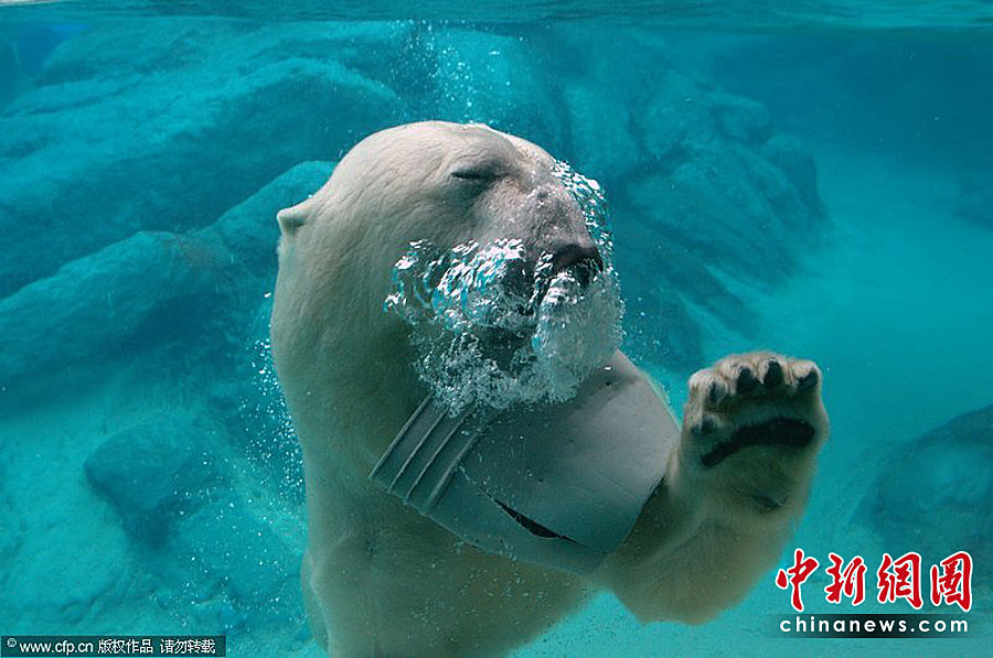 美國Asheboro北卡羅來納動物園一頭名叫威利的北極熊可是個“活寶”。任何一個可用的東西都能成為它在鏡頭前“耍寶”的玩具。圖片來源:CFP