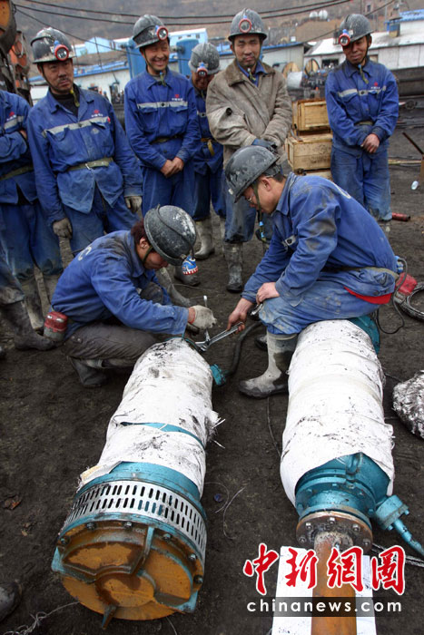 3月29日上午,山西華晉焦煤有限責(zé)任公司王家?guī)X煤礦透水事故搶險工作正在緊張進行中。為救援被困礦工,多方支援的搶險器材、礦山救護隊已經(jīng)陸續(xù)抵達現(xiàn)場。圖為即將組裝完畢的水泵。中新社發(fā) 張云 攝