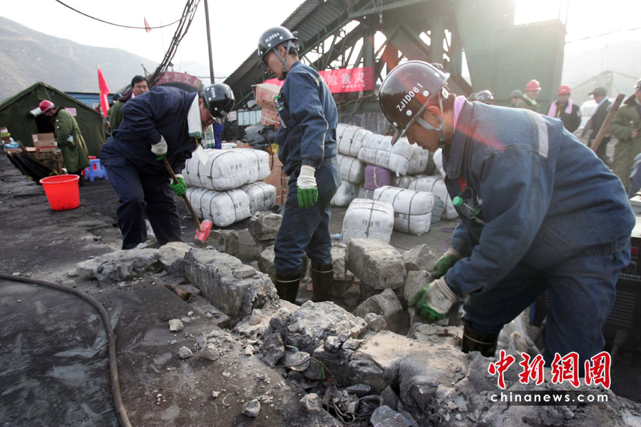 4月4日,華晉焦煤公司王家?guī)X礦透水事故第八天,為了保證急救的一切順利,搶險人員清理并搶修急救通道。中新社發(fā) 張?jiān)?攝