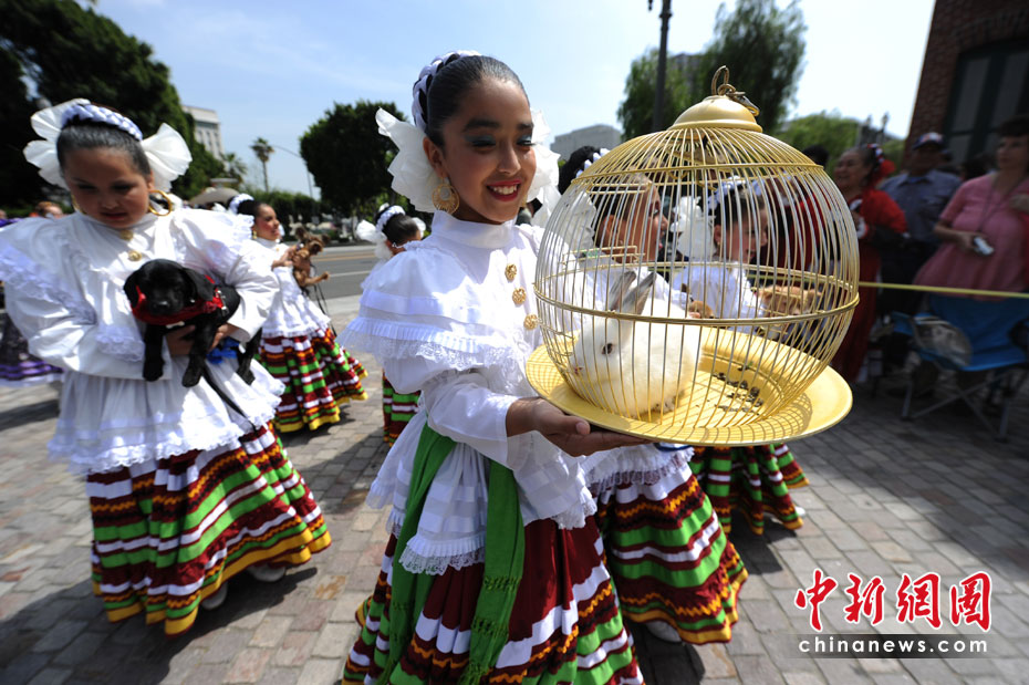 當?shù)貢r間4月4日,美國洛杉磯人們在歡慶復活節(jié)的同時,也為他們的寵物舉行了祝福儀式。這項祝福儀式每年舉行一次。圖片來源:中國新聞網(wǎng)