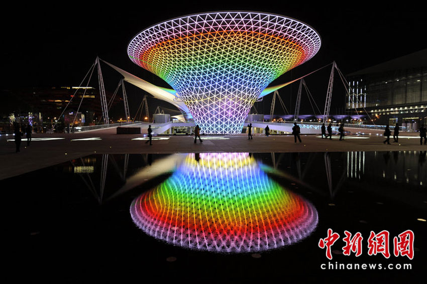 4月8日,上海世博會園區各大洲國家展館的建設和布展絕大多數已經進入尾聲。圖為世博軸太陽谷在水中的夜景。梁臻 攝