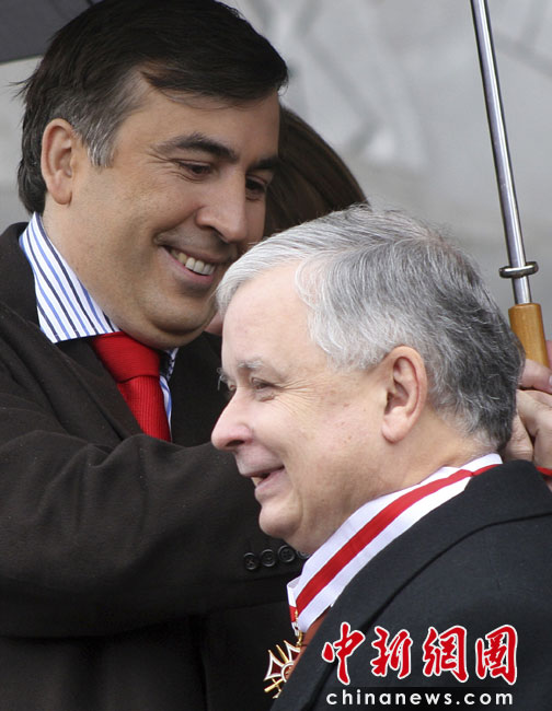 波蘭總統(tǒng)卡欽斯基乘坐的一架圖-154飛機10日在俄羅斯斯摩棱斯克州北部一軍用機場降落時失事,至少87人死亡。卡欽斯基本人被確認身亡。圖為2007年波蘭總統(tǒng)卡欽斯基與格魯吉亞總統(tǒng)米哈伊爾薩卡什維利。