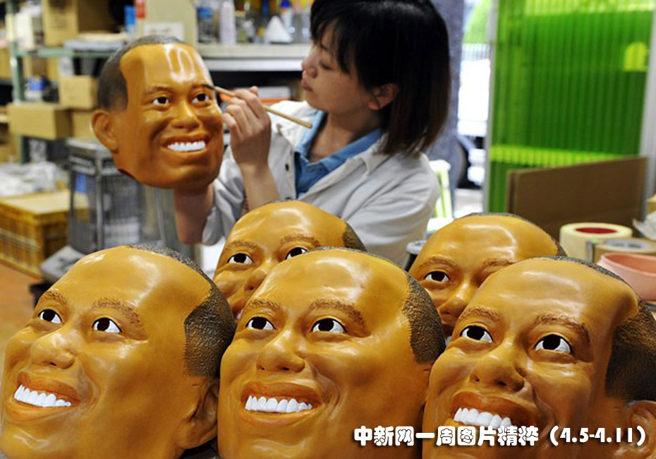 東京郊區的某個工廠正在生產美國頂級高爾夫選手老虎伍茲的橡膠面具。圖為一名員工在面具上勾畫眉眼。