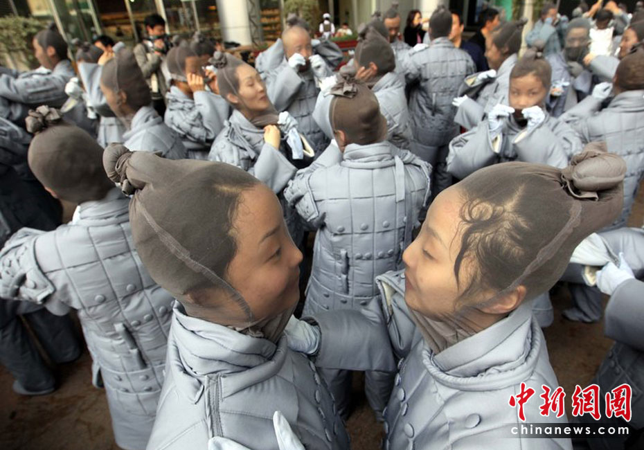 4月10日,由西安旅游局承辦的兵馬俑牽手上海世博會大型旅游宣傳咨詢活動舉行。來自兵馬俑故鄉(xiāng)的百人表演隊伍,身著灰色的兵馬俑服裝,以鏗鏘的節(jié)奏、雄壯的氣勢,在上海南京東路步行街和東方明珠廣場游演,吸引了大批市民及海內(nèi)外游客駐足觀看。文音/CFP