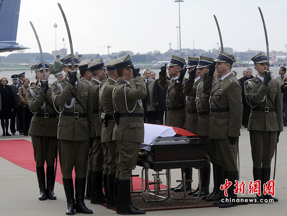 4月10日,卡欽斯基乘坐專機從華沙飛往俄羅斯斯摩棱斯克市,參加卡廷森林事件70周年紀念活動。途中飛機在斯摩棱斯克“北方”軍用機場附近降落時失事,共造成包括卡欽斯基夫婦及眾多政府高官在內的96人死亡。慘劇發生后,舉世震驚。圖為禮兵準備將卡欽斯基的遺體抬上靈車。