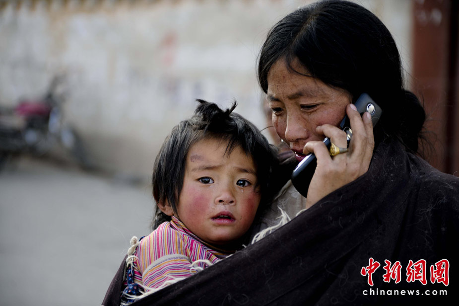 4月15日,青海玉樹縣體育場的地震災民安置點內,一位母親在與親人通話時潸然淚下,懷里小女兒的腳傷還在等待醫治。中新社發 廖攀 攝
