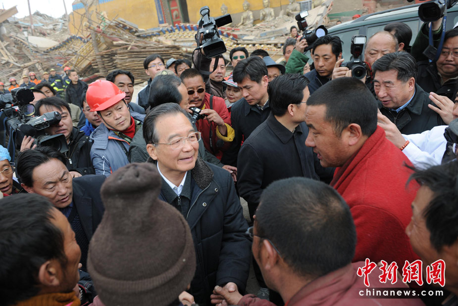 4月16日上午,中國(guó)國(guó)務(wù)院總理溫家寶來(lái)到距離玉樹縣城約10公里的禪古寺,看望受災(zāi)僧侶和民眾。溫家寶表示,只要有一線希望,就將盡最大努力救援,他還慰問(wèn)了正在現(xiàn)場(chǎng)實(shí)施挖掘救援的工作人員。中新社發(fā) 符永康 攝