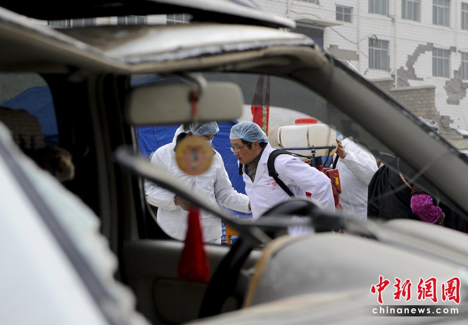 4月16日,青海玉樹體育場地震災民安置點,青海疾控中心人員開展消毒防疫工作。 中新社發 廖攀 攝