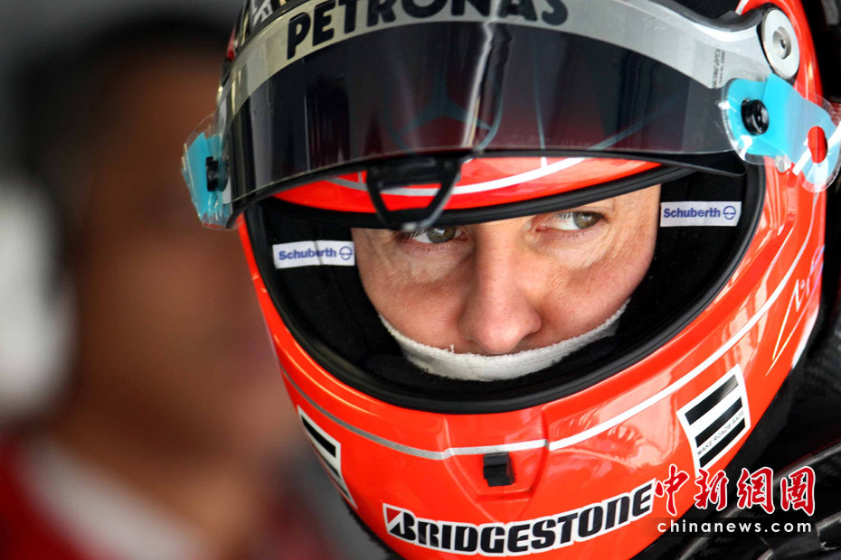 4月16日,2010國際汽聯F1世界錦標賽上海站在上海國際賽車場開始車手第一、第二次練習賽。圖為代表梅賽德斯GP車隊出戰的老車王、德國車手舒馬赫重回上海賽道。 中新社記者 任晨鳴 攝