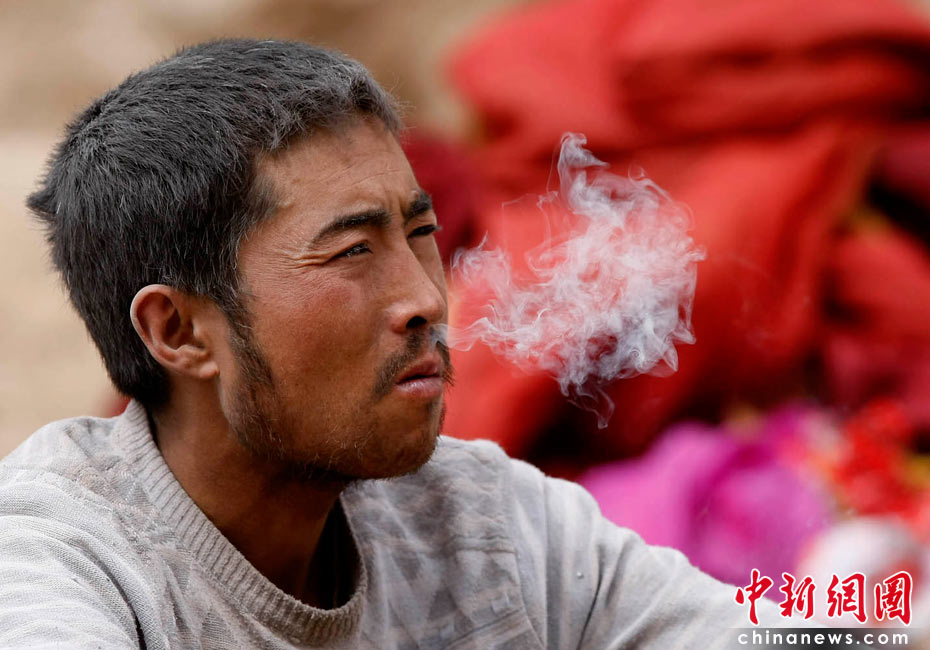 2010年4月16日,青海玉樹藏族自治州玉樹縣結古鎮一所中學的震災救援現場,一名救援人員在短暫的休息期間吸煙解乏。中新社發 盛佳鵬 攝