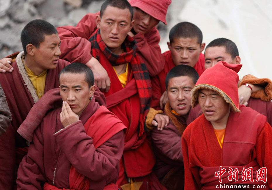 4月16日,青海玉樹結古鎮震災救援現場,當地僧侶在救援現場關注進展情況。中新社發 盛佳鵬 攝