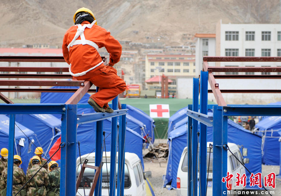 4月17日,青海玉樹體育場受災民眾安置點,工人們安裝臨時板房。中新社發 廖攀 攝