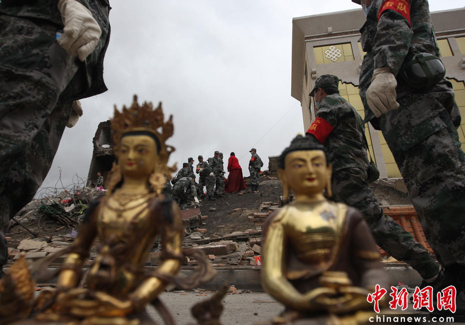 4月17日,青海玉樹結古鎮民主路,解放軍救援隊為受災民眾從房屋廢墟內搜索出多件法器。中新社發 盛佳鵬 攝