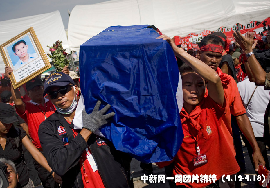 4月12日周一,泰國“紅衫軍”抬著在抗議活動中身亡同胞的遺體和空棺材在曼谷游行,以此警告政府──在18年來最血腥的政治沖突爆發后,已經沒有談判余地。