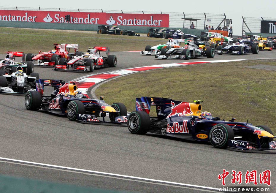 4月18日下午,2010國(guó)際汽聯(lián)F1世界錦標(biāo)賽上海站在上海國(guó)際賽車(chē)場(chǎng)舉行正式比賽,邁凱輪車(chē)隊(duì)的英國(guó)車(chē)手巴頓在雨中獲得冠軍、隊(duì)友、英國(guó)車(chē)手漢密爾頓獲得亞軍,梅賽德斯GP車(chē)隊(duì)的德國(guó)車(chē)手羅斯伯格獲得季軍。圖為比賽發(fā)車(chē)后眾位車(chē)手通過(guò)一號(hào)彎。中新社記者 任晨鳴 攝
