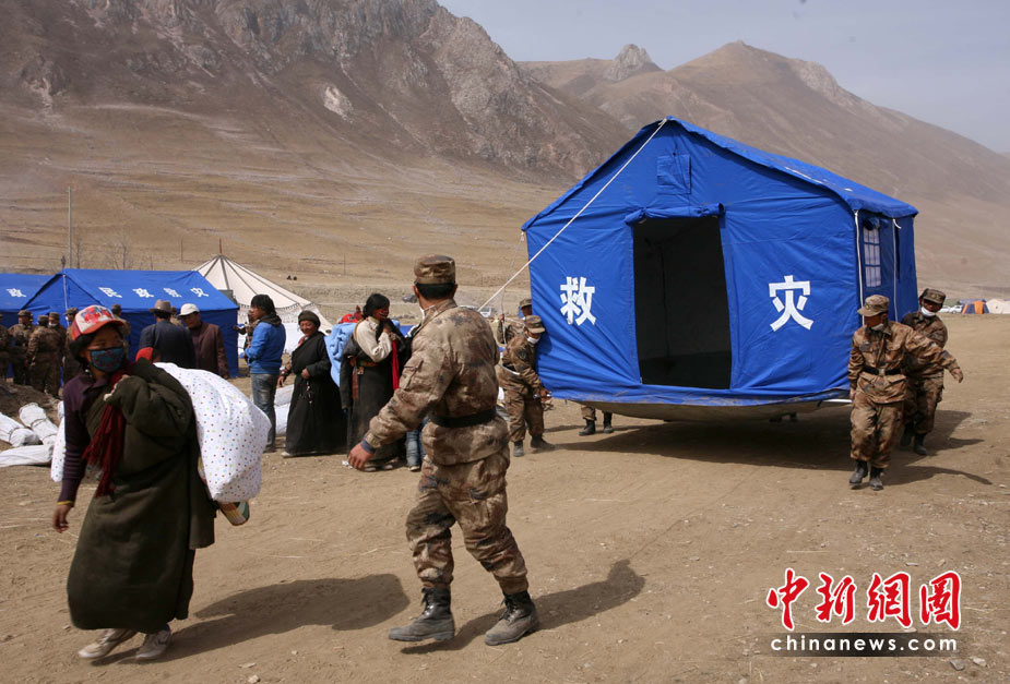 4月18日,青海玉樹囊謙縣扎西科跑馬場災民安置區內,來自甘肅的救援部隊為災民搭建120頂新帳篷,讓在地震中失去家園的災民及時住上帳篷“新”家。中新社發 劉忠俊 攝