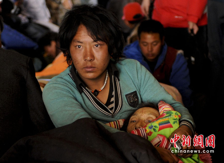4月19日,從玉樹地震災區飛往西寧的空軍運輸機上,兒子緊擁母親前往西寧轉診。中新社發 廖攀 攝