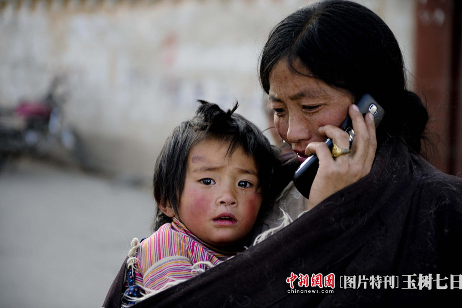 4月15日,青海玉樹縣體育場的地震災民安置點內,一位母親在與親人通話時潸然淚下,懷里小女兒的腳傷還在等待醫治。中新社發 廖攀 攝