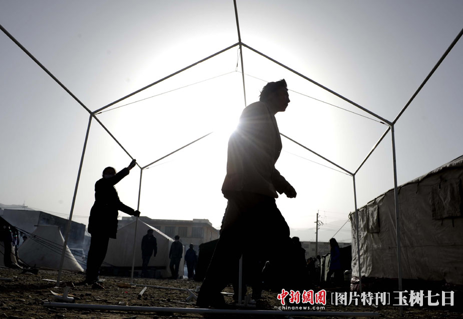 青海玉樹縣體育場的地震災民安置點內,玉樹地震災民正在積極自建抗震帳棚。中新社發 廖攀 攝