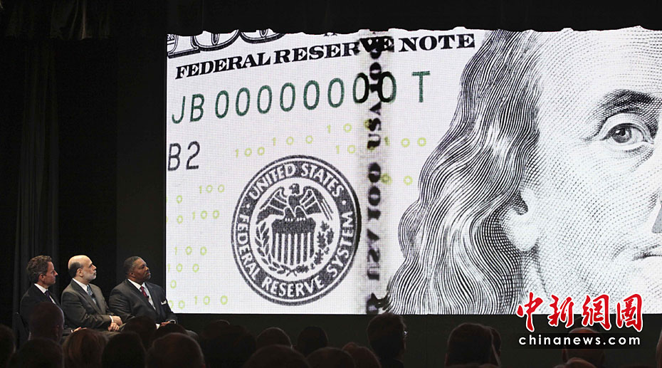 圖為新款百元美鈔發(fā)布會現(xiàn)場