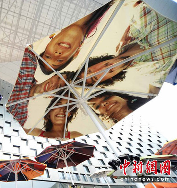 2010年4月22日,上海世博會(huì)主題館門前的觀眾等候區(qū),豎立著一把把遮陽的花傘,每一把花傘上都印著四方友人的燦爛微笑。世博園區(qū)為了應(yīng)對(duì)大量客流,園區(qū)設(shè)置了大量遮陽和避雨設(shè)施,遮陽避雨面積總量達(dá)40萬平方米。楊毅 攝