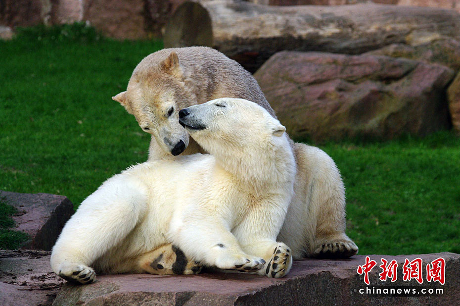 4月23日,德國(guó)紐倫堡動(dòng)物園內(nèi),兩頭北極熊在公園內(nèi)的水池中盡情玩耍,享受春天的陽(yáng)光。圖片來(lái)源:中國(guó)新聞網(wǎng)