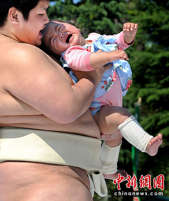 4月25日,日本東京,幾名相撲手手抱嬰兒,正努力使嬰兒哭泣。當(dāng)日,一年一度的日本一周歲以下嬰兒啼哭大賽在東京淺草寺舉行。第一個(gè)讓嬰兒哭泣的選手將贏得比賽,日本通過此種比賽為孩子的健康祈福,他們認(rèn)為嬰兒哭泣將對他們將來的身體健康有利。圖片來源:中國新聞網(wǎng)