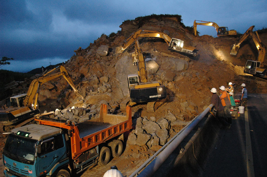 4月25日, 臺(tái)灣一條交通要道、“北二高”基隆段發(fā)生山崩意外,傾瀉而下的土石壓垮一座高架橋,并覆蓋道路約200米,據(jù)傳有人車被埋。圖為工程人員連夜開(kāi)挖,展開(kāi)大搜救(圖片來(lái)源:“中央社”)。