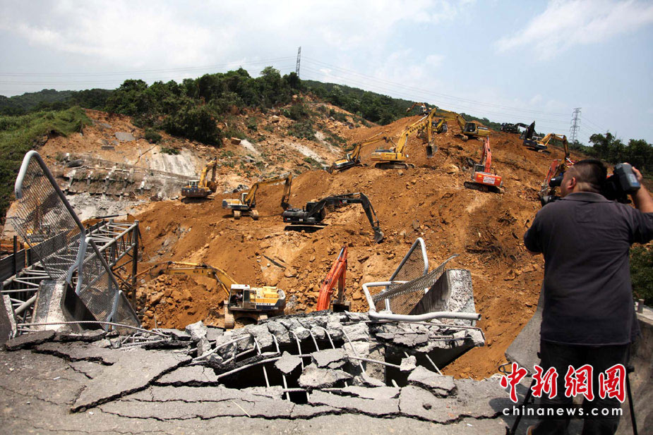 4月26日,臺(tái)灣“北二高”基隆段山崩斷橋意外第2天,工程人員繼續(xù)開(kāi)挖,將攔腰被斬?cái)嗟穆窐虿鸪形磳か@被埋的數(shù)輛人車。圖為當(dāng)日中午,記者另繞山路爬上斷橋拍到的情景,依然觸目驚心。中新社發(fā) 董會(huì)峰 攝