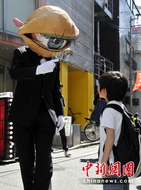 4月26日,日本一個(gè)表演藝術(shù)團(tuán)體扮成“獨(dú)眼怪人”在街頭亮相,大玩行為藝術(shù)。