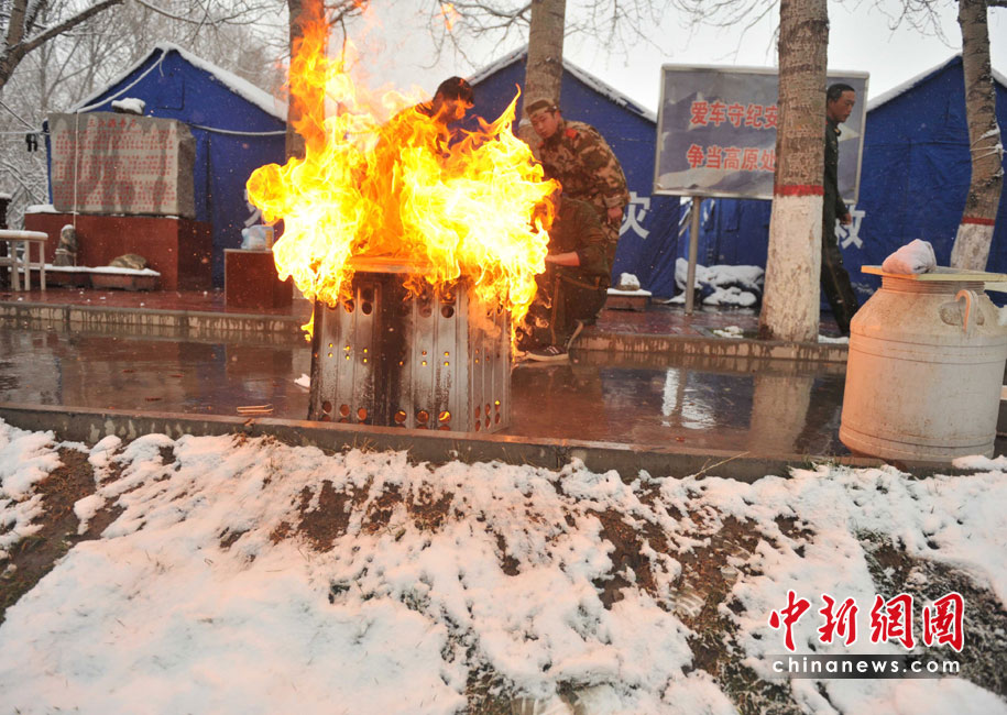 武警青海總隊玉樹支隊是最先投入抗震救災的先鋒部隊,地震發生時恰逢部隊出操,營房嚴重受損而官兵平安無恙。這里立即成為抗震救災的軍民和媒體的大本營之一,醫療救護隊和新型炊事車晝夜為軍民服務。集結在地震災區的各路部隊從4月低之前全面轉入安置群眾和災后重建,這里的的后勤已經得到基本保障。 圖為武警新型炊事車利用氣化爐冒著雨雪為救援官兵和受災民眾做飯。 中新社記者 賈國榮 攝