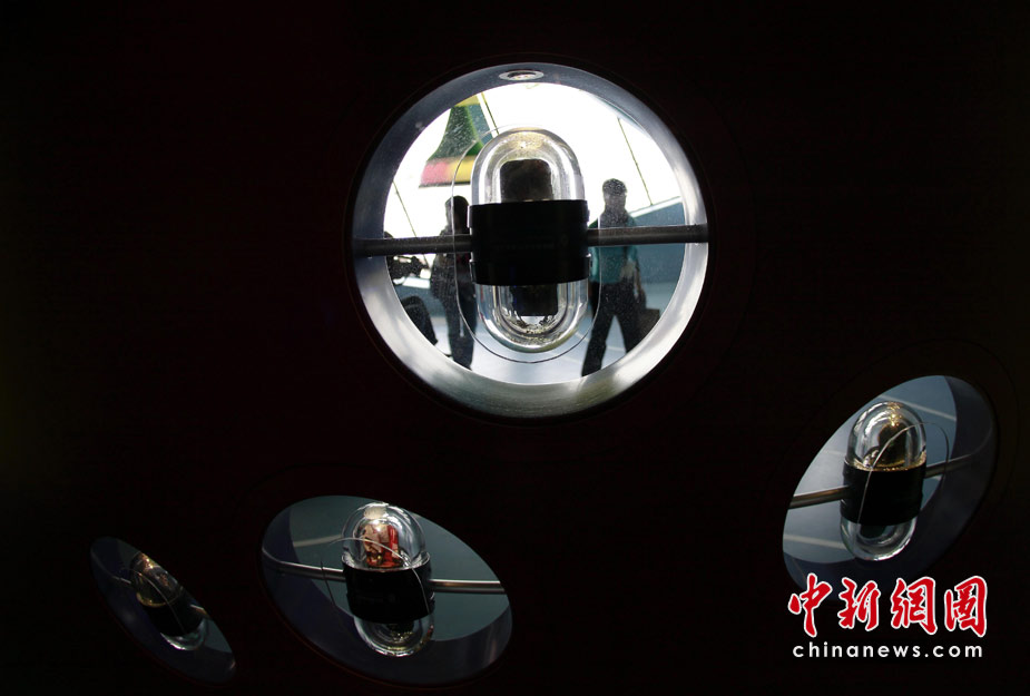4月27日,人們經(jīng)過上海世博園德國館內(nèi)的展品墻。中新社發(fā) 盛佳鵬 攝