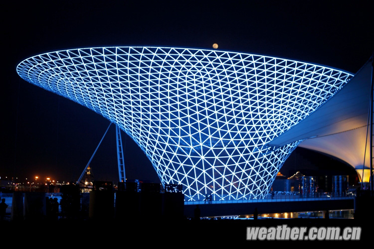 2010年4月27日,上海世博會開幕式彩排順利進行。圖為世博園內(nèi)中軸線上美麗的世博。卞赟 攝
