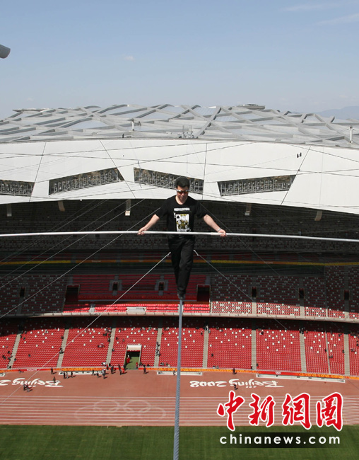 4月29日,有高空王子之稱的新疆小伙阿迪力在鳥巢上空成功試演達瓦孜(高空走鋼絲)。5月3日起,他將在北京國家體育場(鳥巢)頂棚上搭建的小屋生存60天,其間每天將進行約5個小時的高空走鋼絲表演。 中新社發(fā) 蘇丹 攝