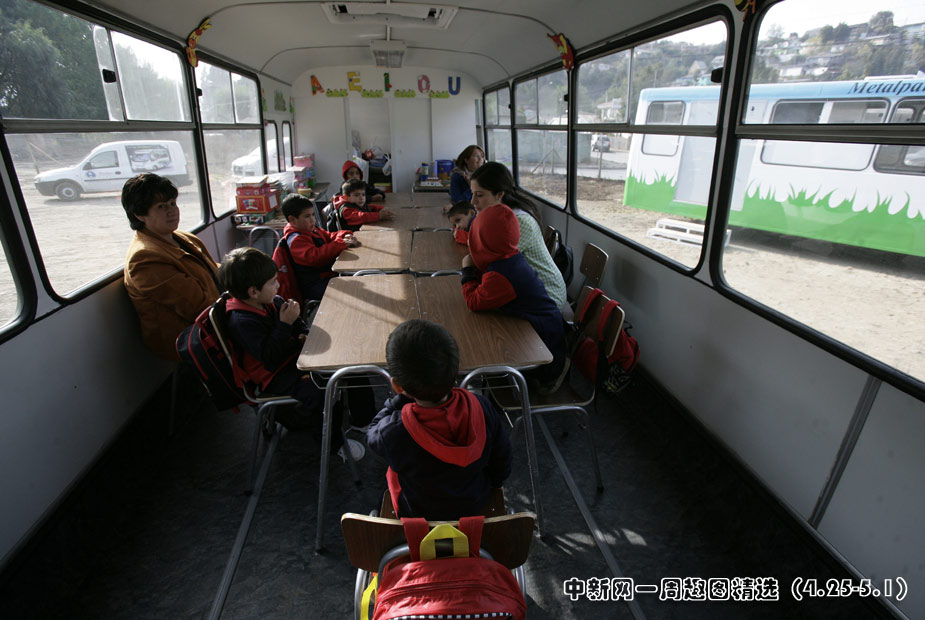 4月26日,今年2月遭受8.8級強烈地震的智利康塞普西翁市,兒童們在“巴士學校”里上課。圖片來源:中國新聞網>>點擊觀看詳細內容
