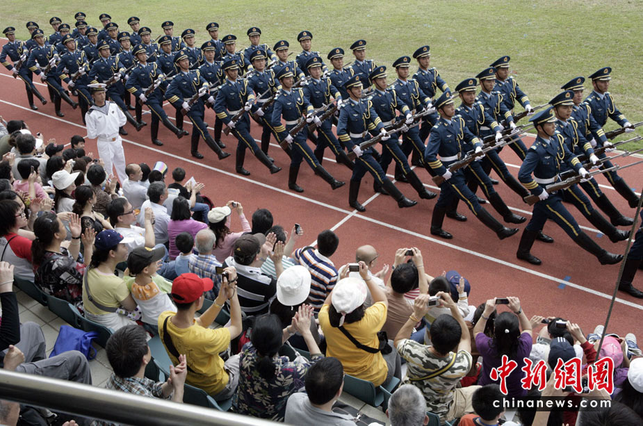 為慶祝“五一”國際勞動節,進一步增進與香港社會各界相互溝通與交流,中國人民解放軍駐香港部隊5月1日開放了昂船洲軍營。圖為香港市民們爭睹駐港部隊三軍儀仗隊風姿。中新社發 張勤 攝
