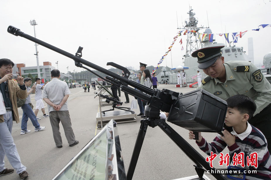 為慶祝“五一”國(guó)際勞動(dòng)節(jié),進(jìn)一步增進(jìn)與香港社會(huì)各界相互溝通與交流,中國(guó)人民解放軍駐香港部隊(duì)5月1日開(kāi)放了昂船洲軍營(yíng),共有約13000名市民前往參觀。圖為香港市民近距離參觀武器展示。中新社發(fā) 張勤 攝