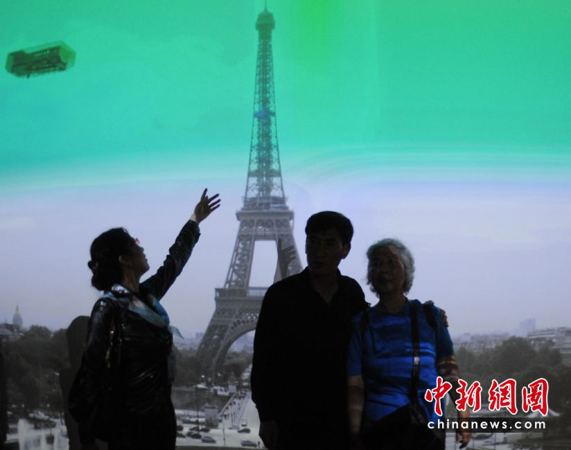 5月2日,上海世博園內,中國游客在法國館親密接觸艾菲爾鐵塔影像。中新社發 廖攀 攝