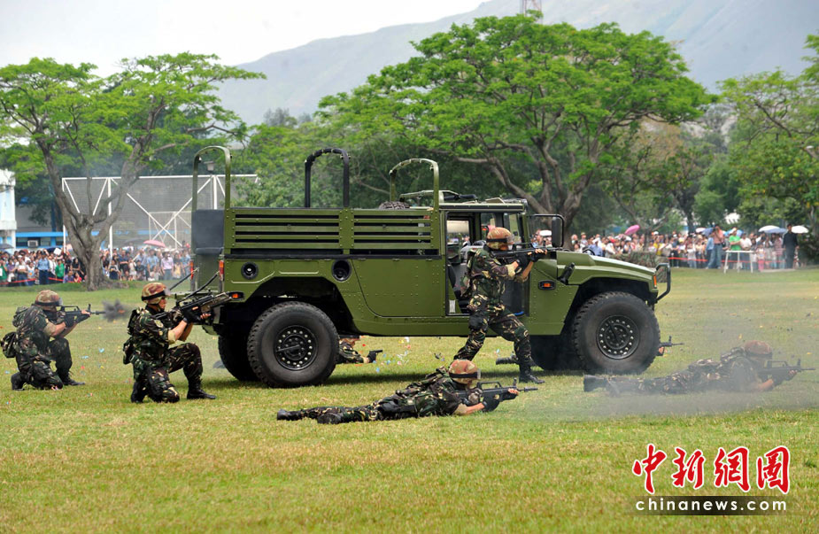 為慶!拔逡弧眹H勞動節,進一步增進與香港社會各界相互溝通與交流,中國人民解放軍駐香港部隊5月2日開放了石崗軍營。圖為駐港部隊“獵人戰斗”表演。 中新社發 鄧慶樂 攝