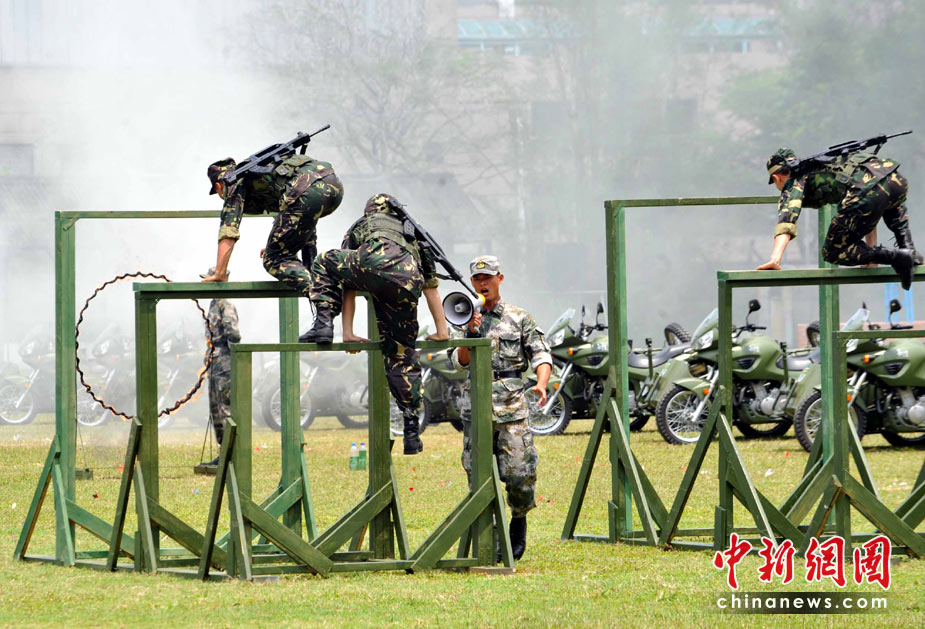 為慶祝“五一”國際勞動節,進一步增進與香港社會各界相互溝通與交流,中國人民解放軍駐香港部隊5月2日開放了石崗軍營。圖為駐港部隊精彩的表演。 中新社發 鄧慶樂 攝